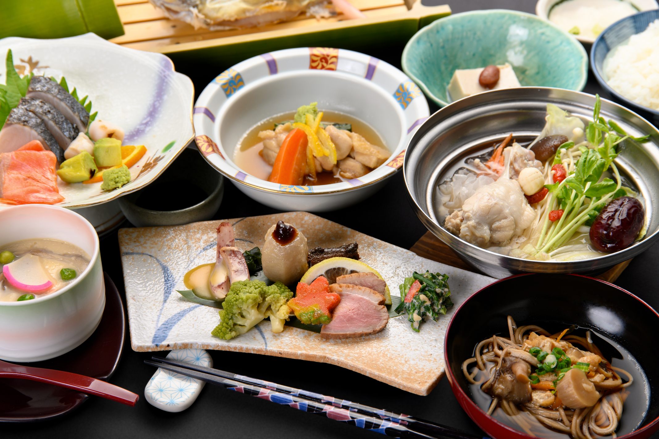 信州のこだわりが詰まった、体にやさしい食材を厳選。田んぼや栽培法にこだわり、丁寧に育てられた「ミルキークイーン」をはじめ、旬野菜を使用した料理の数々。調味料も、昔ながらの杉樽仕込みで作られた醤油や味噌を取り入れております。「信州の食材、とくに旬野菜を楽しんでいただきたい」との想いを胸に、料理長みずから一品一品丁寧に仕上げた、健康にも配慮したヘルシーな創作会席をお楽しみください。