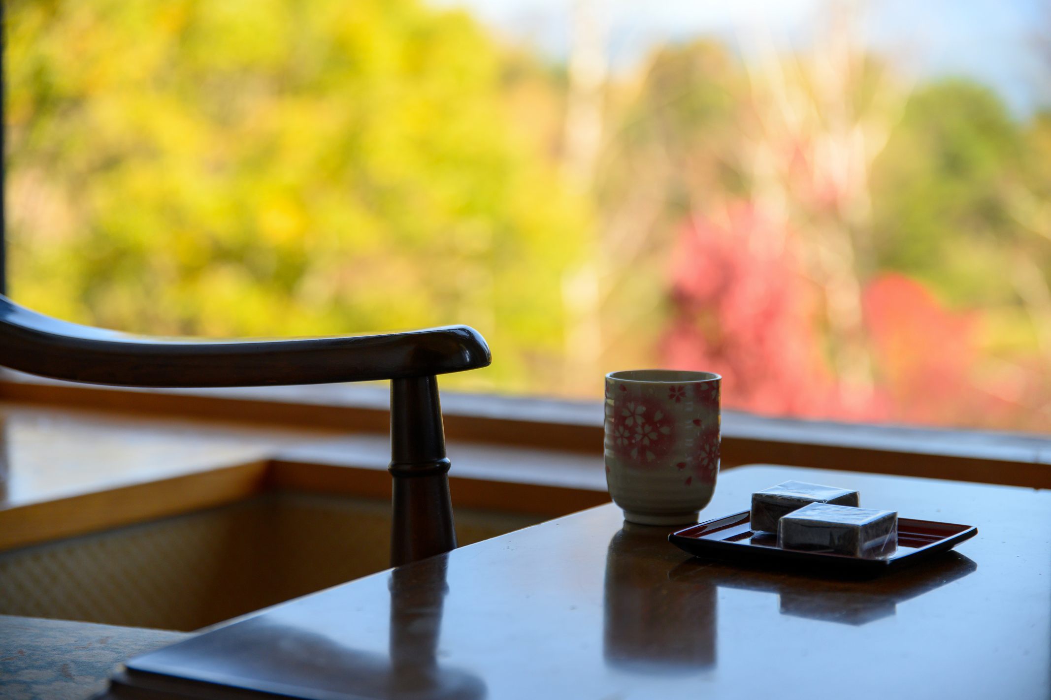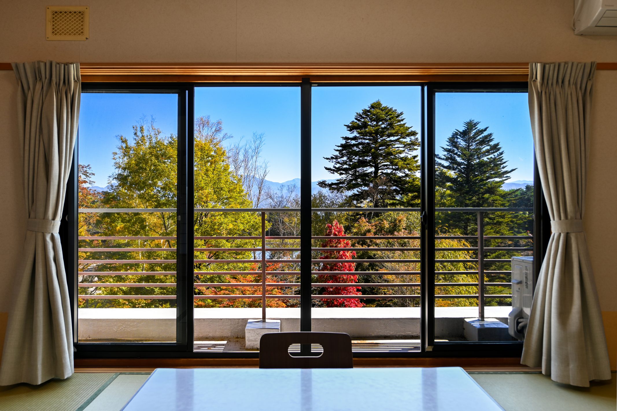 和室8畳+広縁湖畔とは反対側の、8畳+広縁のゆったりとした和室です。窓の外には雑木林が広がります。